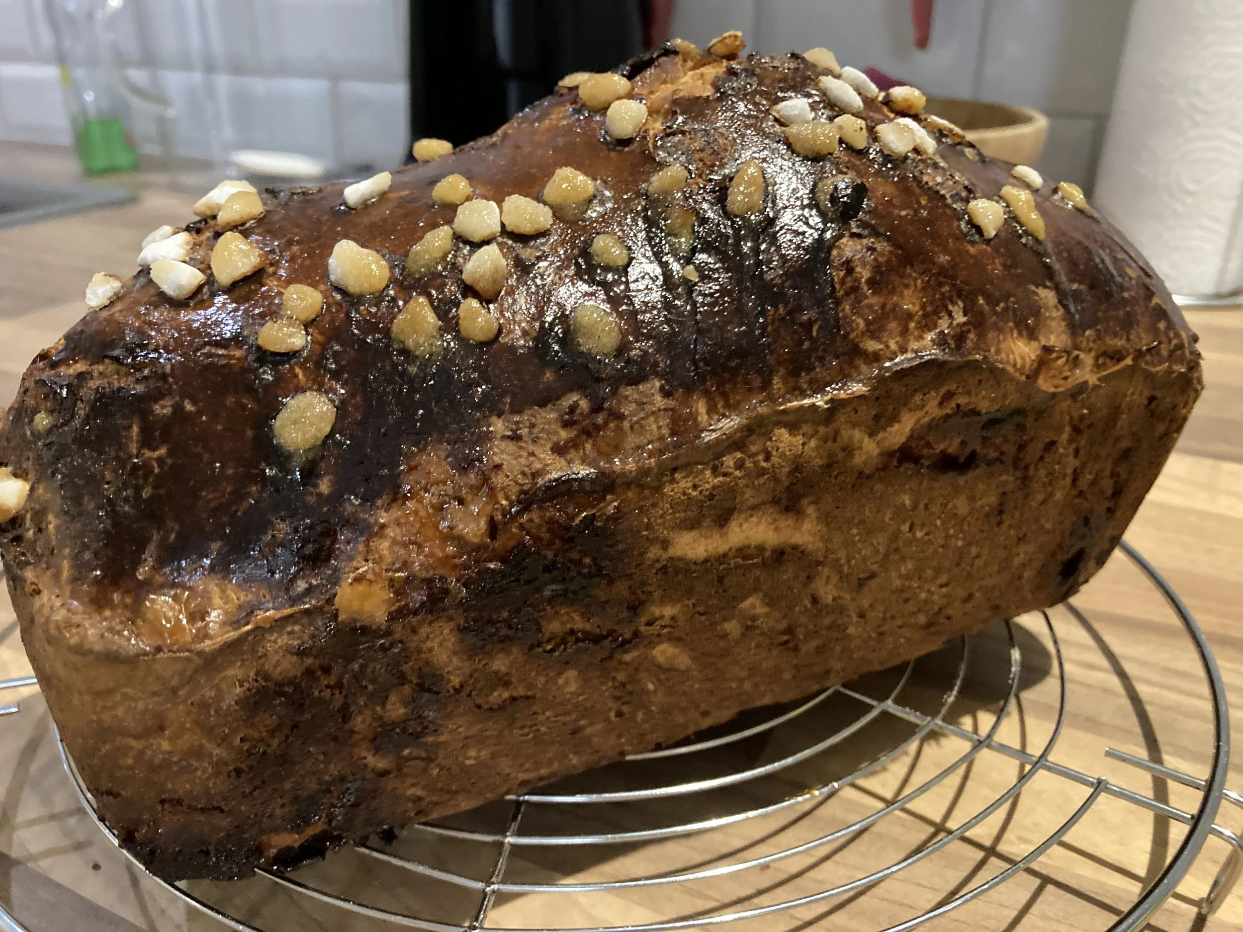 Ik ben ermee an de slag gegaan, en dit is het resultaat. Al tamelijk geslaagd, maar de karamelstukjes mochten nog aanweziger zijn en het brood zou van een bloem met notensmaak (spelt of khorasantarwe) profiteren.
