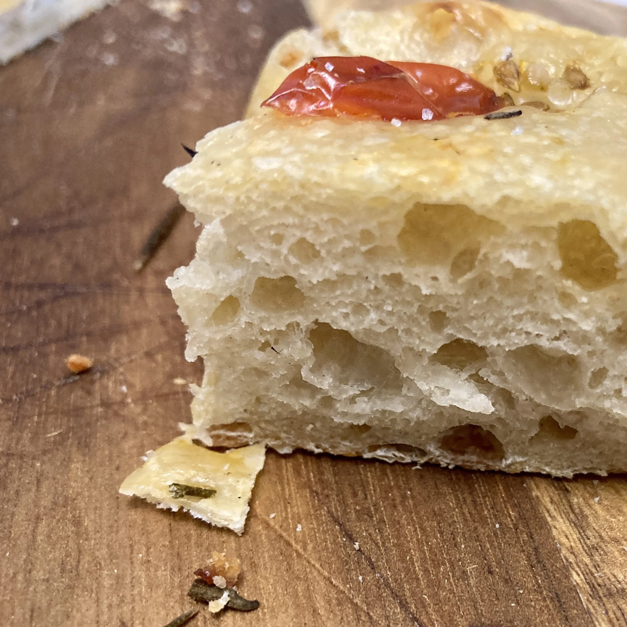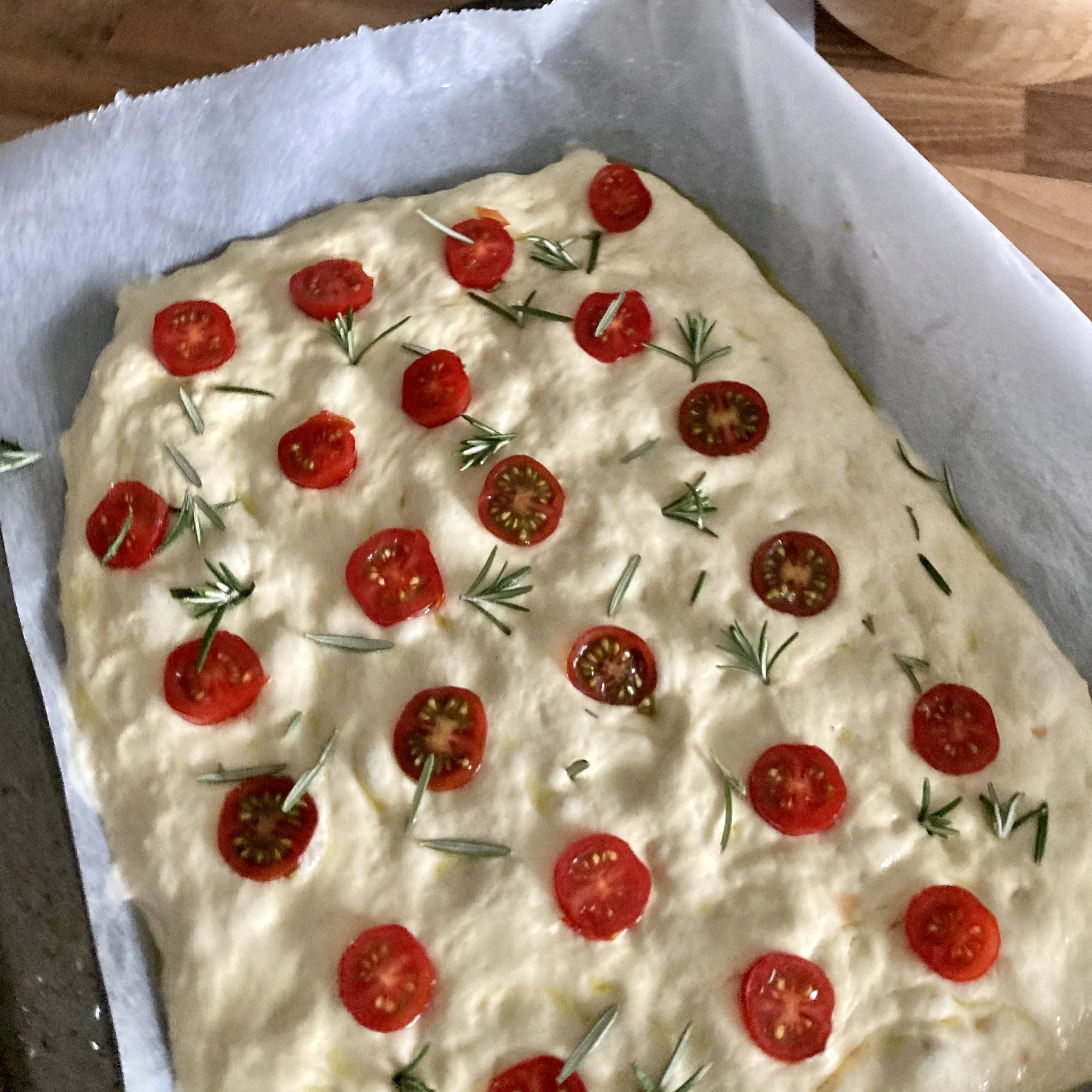 Ik ga mijn gasten dit jaar deze focaccia met desem aanbieden. Zij is heerlijk luchtig en bovendien knapperig als een pizzabodem, en met de smaakmakers tomaten / rozemarijn / zeezout en ideale begeleider voor elke maaltijd.