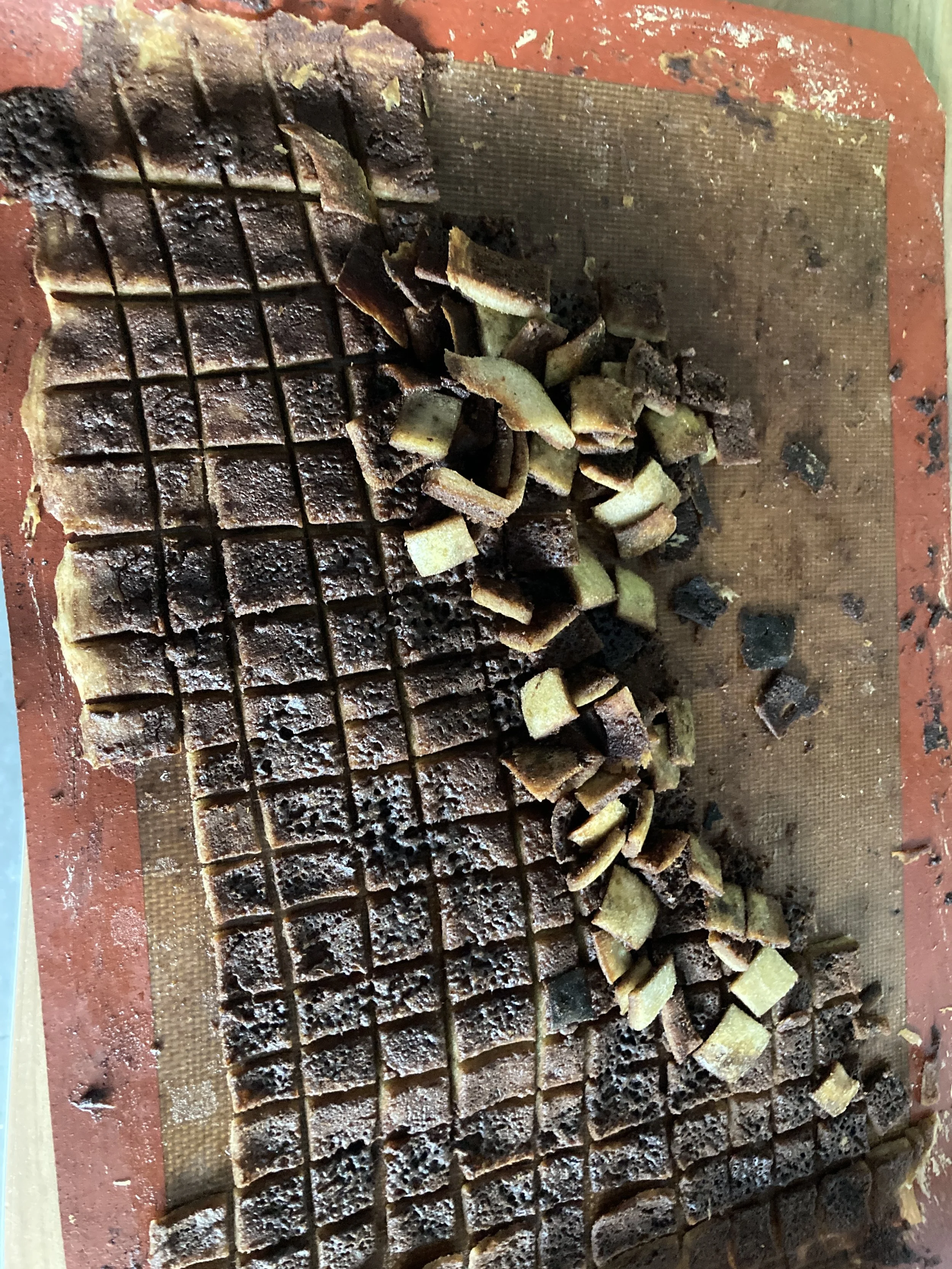 Na 20 minuten de vierkantjes door elkaar hutsen en dan naar eigen voorkeur bij 100°C verder drogen